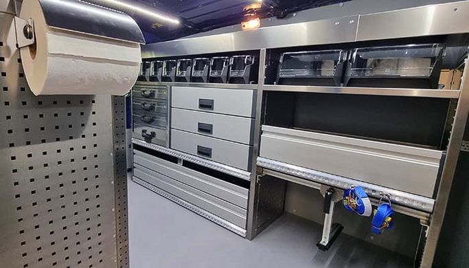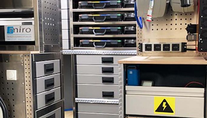 Eine mobile Werkstatt muss u.a. genügend Platz für sämtliche Arbeitsmittel und Werkzeuge bieten. Besonders wichtig ist hier ein hohes Maß an Ordnung und Übersichtlichkeit.