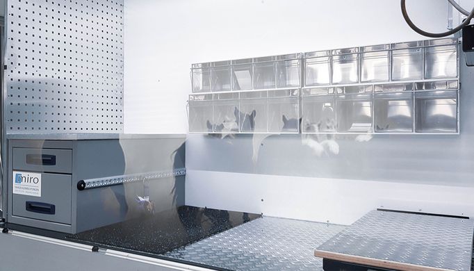 Das kann ein Labor- oder Messfahrzeug mit hochempfindlichen Analyse-bzw. Messgeräten, komplexer Computertechnik oder Reinraumumgebung sein. Oder eine mobile Hufschmiede, die von A wie Amboss bis Z wie Zange alles an Bord haben und gleichzeitig höchste Funktionalität und Ästhetik in sich vereinen muss. Oder ein Taucherbus mit Ablaufwanne für Taucheranzüge, Flaschenhalter und Stromversorgung. Oder ein Tatorteinsatzfahrzeug der Polizei mit Sondersignalanlagen. Oder ein Einsatzleitwagen der Feuerwehr. Oder eine mobile Pferdepraxis….
